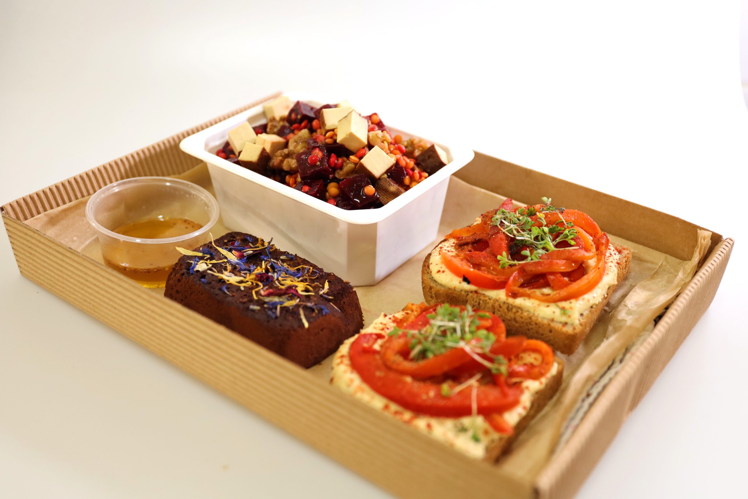 VEGAN – Osvěžující salát s pečenou červenou řepou, červenou čočkou a citrusovým dresinkem, žitný chléb s cizrnovým humusem a pečenými paprikami a lahodné brownies s malinami a ořechy. Ideální volba pro veganskou stravu plnou chutí.